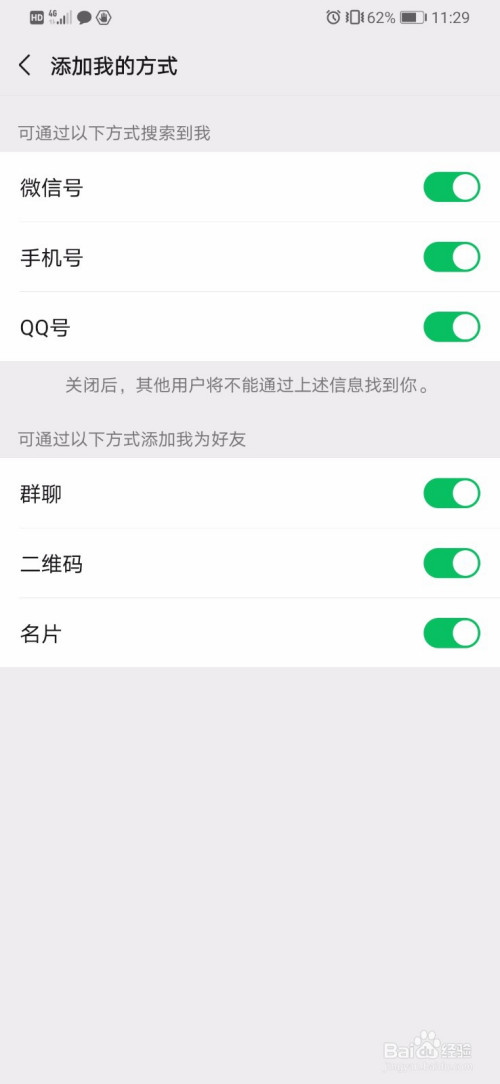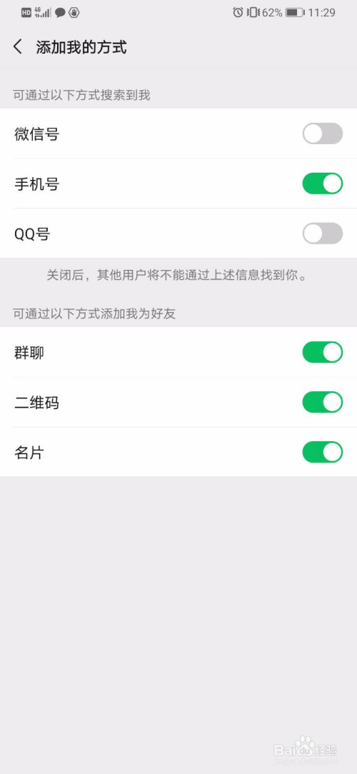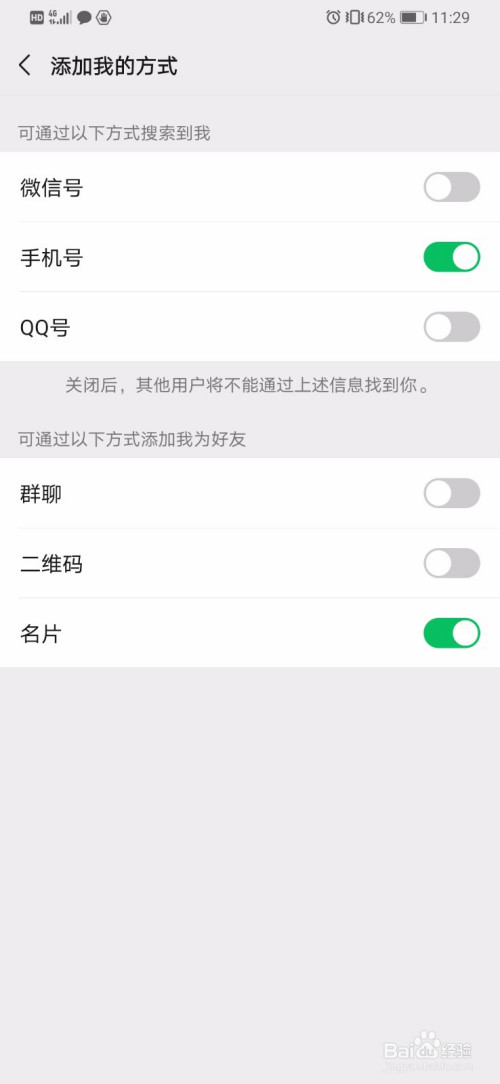 在最上方,我们需要封闭其他的两个选项,留下手机号这个内容,这样别人就可以经由过程手机号添加我们了。