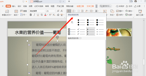 设置幻灯片的项目符号,选择合适的预设项目符号。