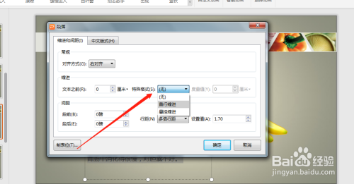 设置幻灯片的段落格局,设置段落行距。