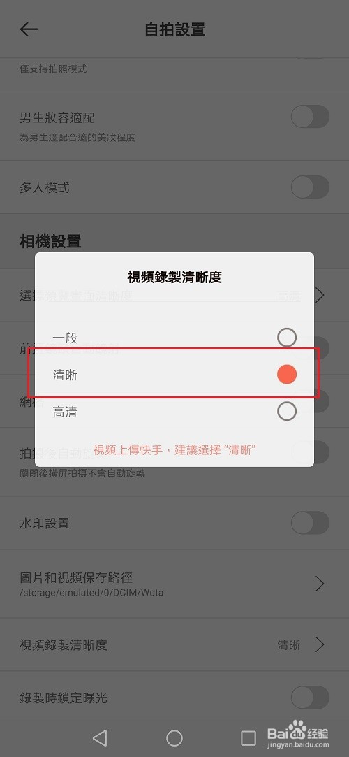 第四步进去自拍设置之后,点击视频清楚度