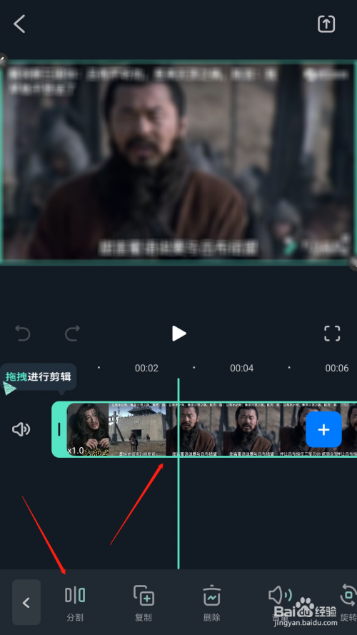 拖动视频轨道的进度,在要剪辑的位置停下。然后点击左下角的朋分按钮。