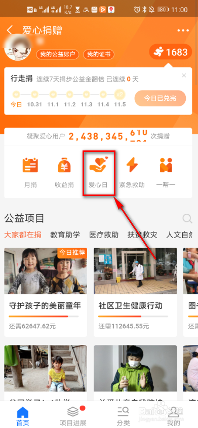 1、解锁手机,点击支付宝。2、在我的界面里,点击我的公益。3、界面跳转,点击爱心日。4、上下拖动界面,选择肆意一个活动。5、界面跳转,查看项目具体环境,点击底部单笔捐。