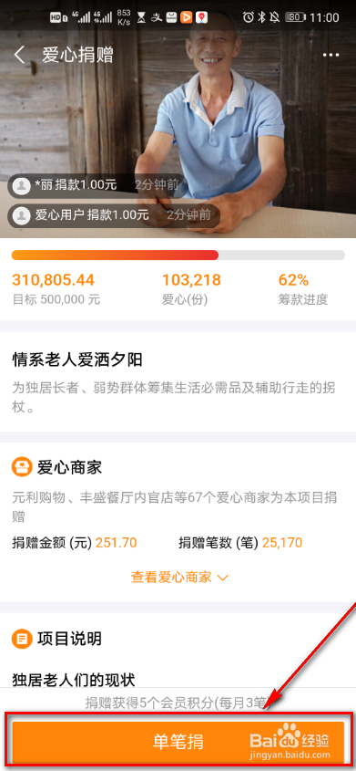 界面跳转,查看项目具体环境,点击底部单笔捐。