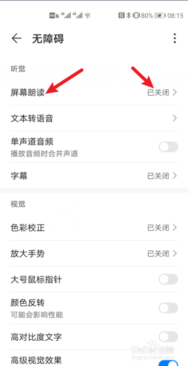 在无障碍界面看到【屏幕朗读】在已封闭状况。