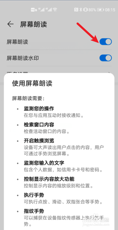 把【屏幕朗读】开关打开,开启朗读模式。