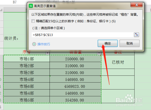 弹出高亮显示反复值页面,点击确定(若没有提前选中表格区域,在这一步调拔取也是可以的)。