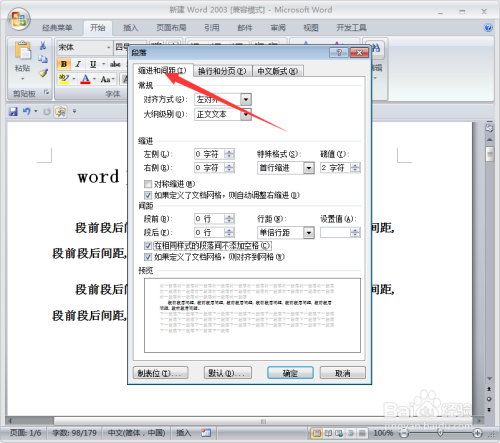 为了区分,我们在行距设置段前2行,断后3行,点击确定