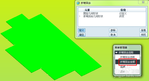 选择固定几何后弹出折弯归去菜单,有“折弯归去拔取”和“折弯归去全数”两种选择。这里我们先接管默认的“折弯归去拔取”,点击完当作。