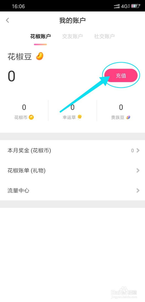 第三、进入花椒直播“我的账户”页面,点击“充值”花椒豆;