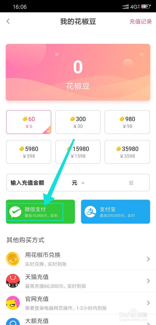 第四、在我的花椒豆页面选中金额,然后选择充值体例,如微信支付;