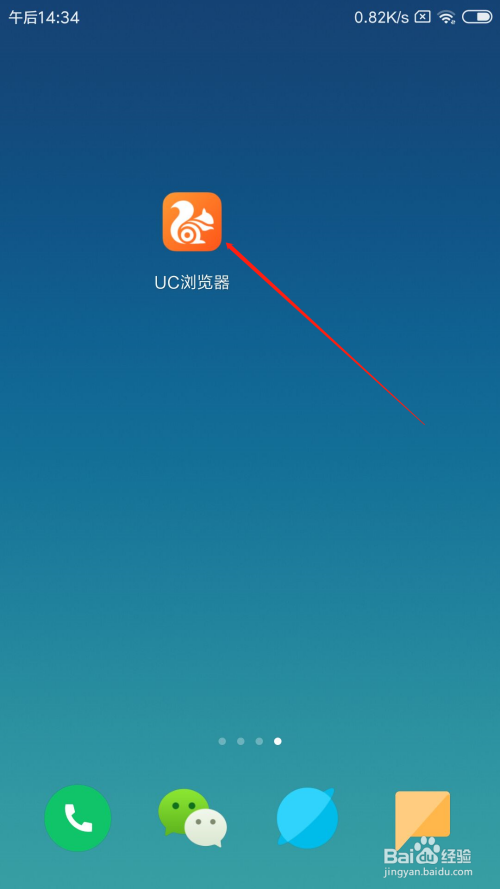 打开手机桌面,点击绵央肤UC浏览器的图泉宋标。