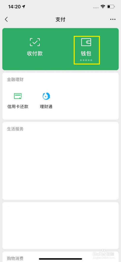 在支付的本家儿页边够面中,我们点击进入钱包选项。