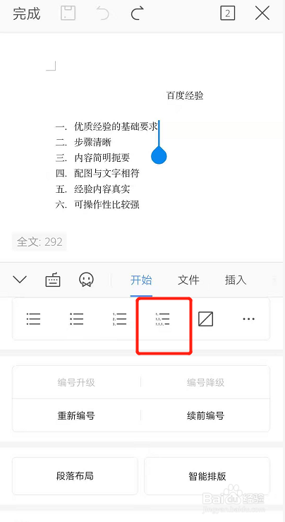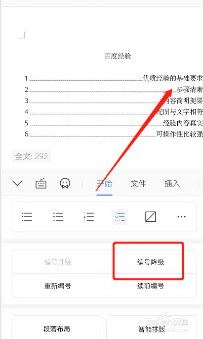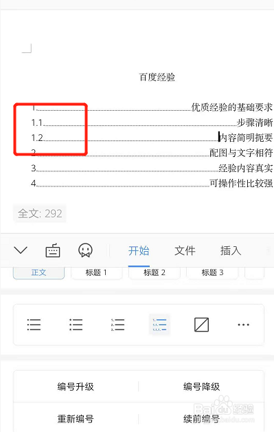 接下来,点击需要降级的侧边文字前,再点击编号降级。