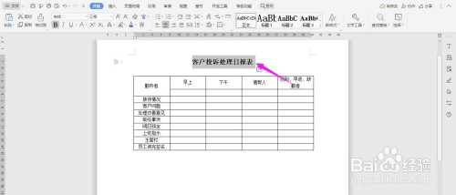 在表格上面输入“客户投诉处置日报表”字体加粗、居中、调大,这样表格就率季建造完当作了