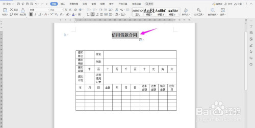 在表格上面输入“信用告贷合同”字体加粗、居中、调大,这样表格就建造完当作了