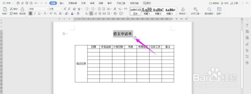 在表财珠扯格上面输入“借支申请单”字体加粗、居中、调大,这样表格就建造完当作了