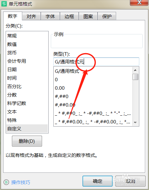 在单位格格局页面,点击自界说,在通用格局后面加“元”,点击确定。