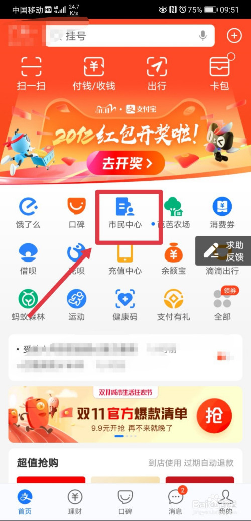 在支付宝首页,找到市民中间功能,点击进入;