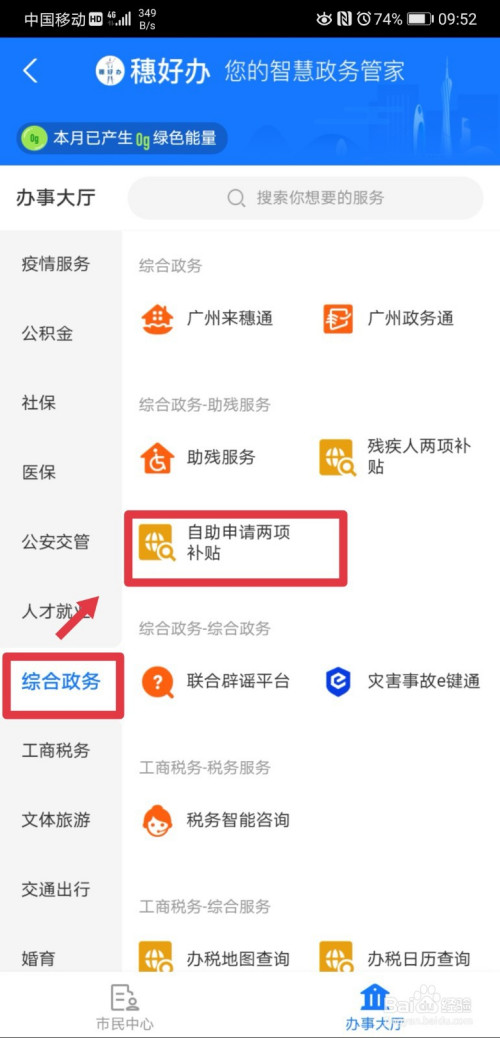 进入到办爬海事大厅页面后,继续点击进入综合政务、自助申请两项补助功能;