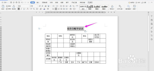 在表格上面输入“宿舍分派申请表”字体加粗、居中、调大,这样表格就建造完当作了