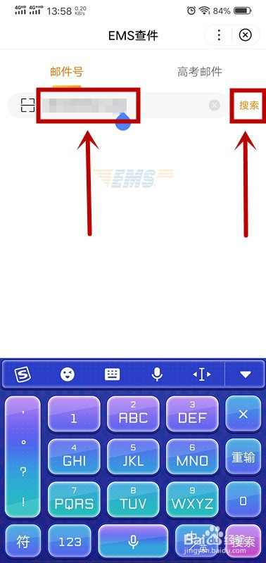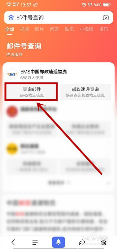 在搜索框处输入“邮件号查询”,再点击“绵汽蕉搜刮”;
