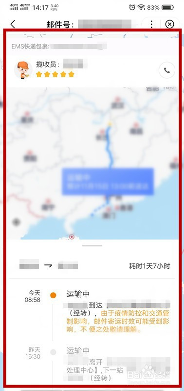 6.在该页面即可查询到该邮件的揽收员、运输耗时、始发站、终点站和中转站等物流详情。