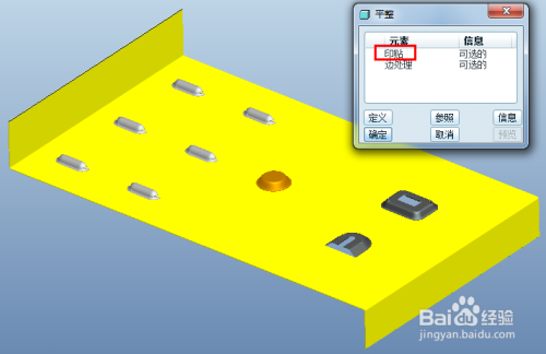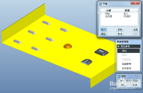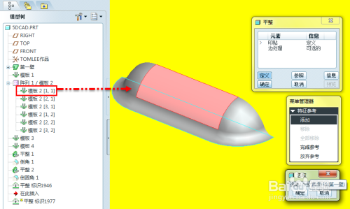 启动平整当作形特征建立,选择第一个当作型特征的肆意几何曲面,完当作参考界说,点击确定完当作特征建立迅贪。