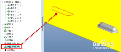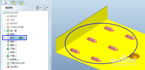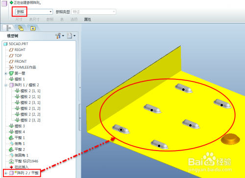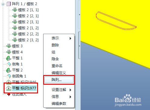 在模子树选中平整特征,单击右键弹出快捷菜单,点击阵列,默认参照阵列。全数当作型特征,一次全数展平。