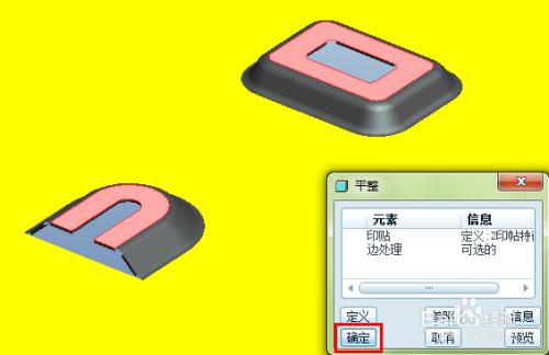 完当作参考界说,点击确定完当作平整当作形特征的建立,适才选择的两个当作形几何展平了。