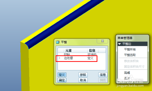 选择平整对话框中的“边处置”,可以对钣金件上有倒角和倒圆角的边建立平整。可以在菜单选择“平整所有”,整个钣金件主动计较,也可以选择“平整拔取”然后按照本身手动选择来完当作平调昆码整当作形。