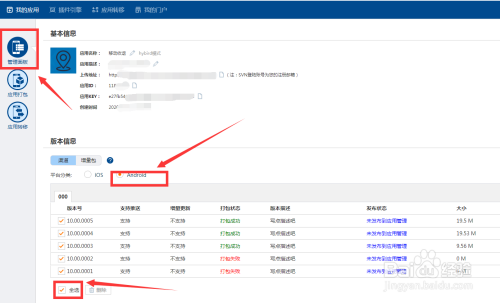 3.然后进入到办理面板,选择平台分类(Android),全选已发布版本。