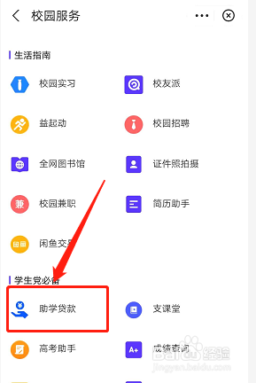 下滑页面,点击助学悦游贷条目,槐陵帮。