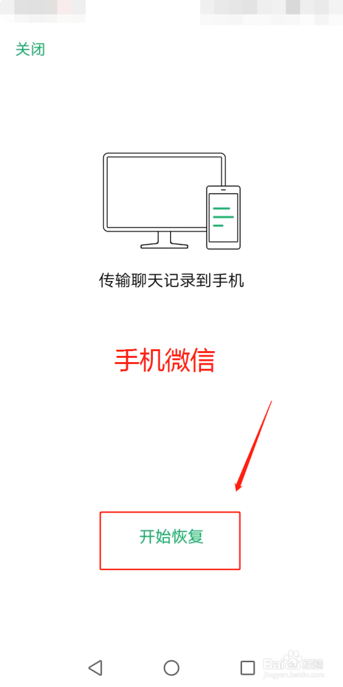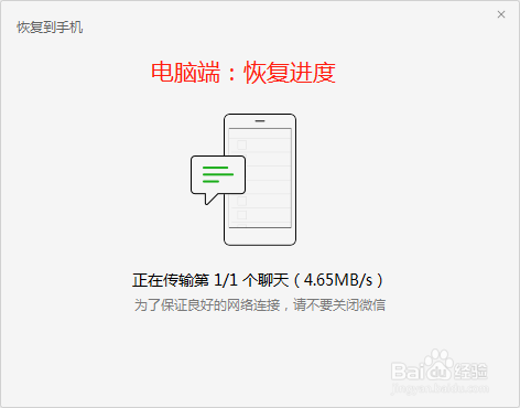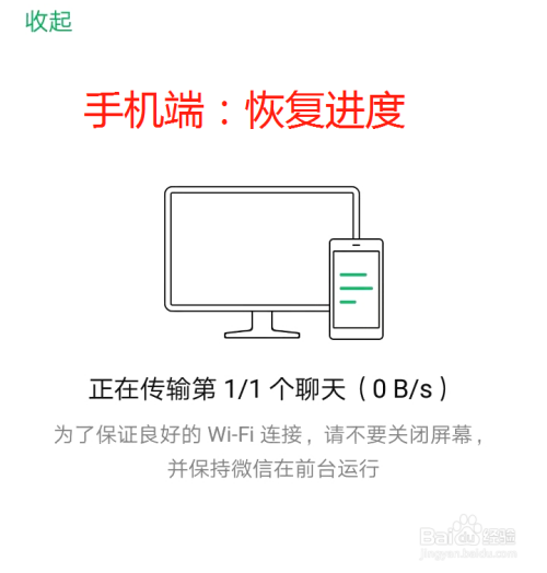 在手机微信“起头恢复”页面,单击【起头恢复】,手机端和电脑端同时显示“恢复进度”。