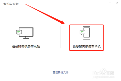 在备份与恢复页面,单击【恢复聊天记实至手机】,打开“选择需要传输的聊天记实”对话框。