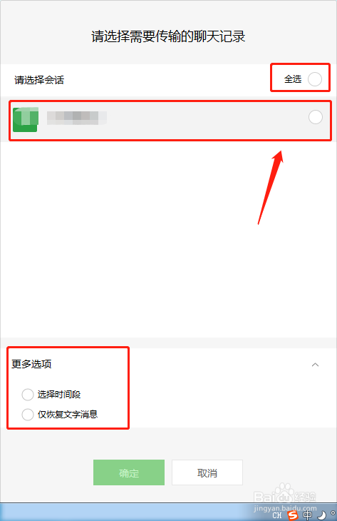 在选择需要传输的聊天记实对话框,单击圆圈选择需要恢复的特定对话蹲绵或全选,并按照需要设置“更多选项”参数。