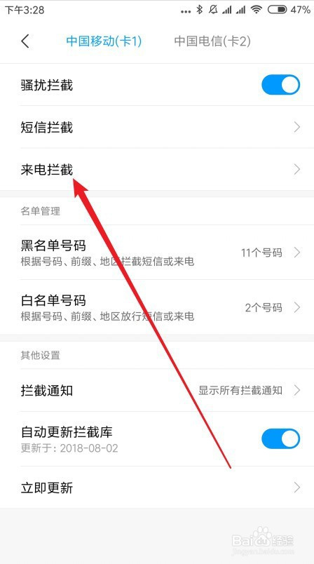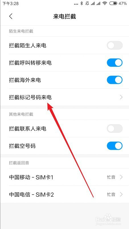 然后在打开的页面点击来电阻挡设置项。