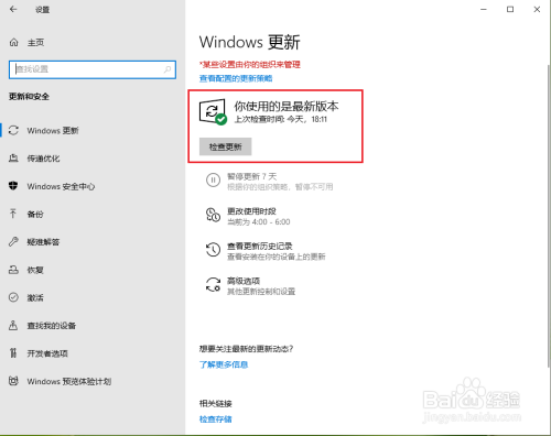 注重:若是搜索框打不开更新设置,请依次点击【起头】按钮>>【设置】>>【更新和平安】。