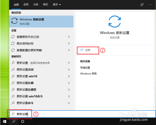 点击电脑左下角的搜索框,输入“更新设置”,然后点击【打开】。