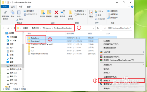 打开“C:\Windows\SoftwareDistribution”文件夹,删除“DataStore”和“Download”文件夹。