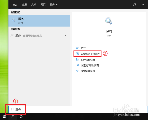 点击电脑左下角的搜索框,输入“办事”,然后点击【以办理员身份运行】。