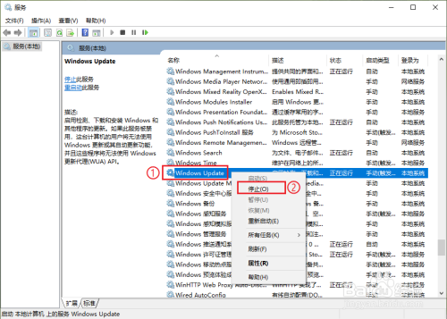 右键点击“Windows Update”,在弹出的菜单中点击【遏制】。