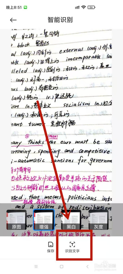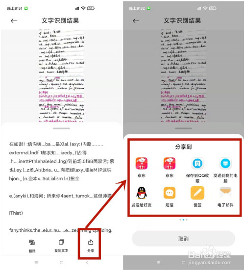 3.点击右下角的识别文字,紧接着点击分享,按想分享的体例操作。
