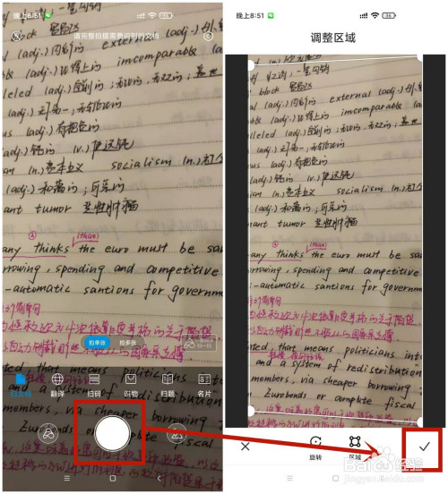 2.瞄准需要操作的内容,点击页面的拍摄小标,调整区域后点击√小标。