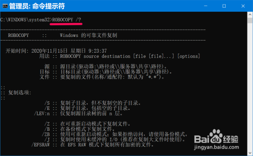 如需要查看robocopy的利用方式,可以办理员号令提醒符窗口中输入:robocopy /?,回车。