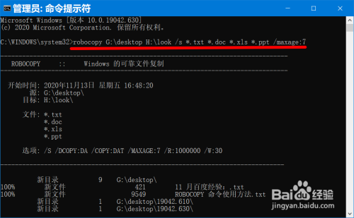 复制 robocopy G:\desktop H:\look /s *.txt *.doc *.xls *.ppt /maxage:7 到办理员号令提醒符窗口中,按下回车键。