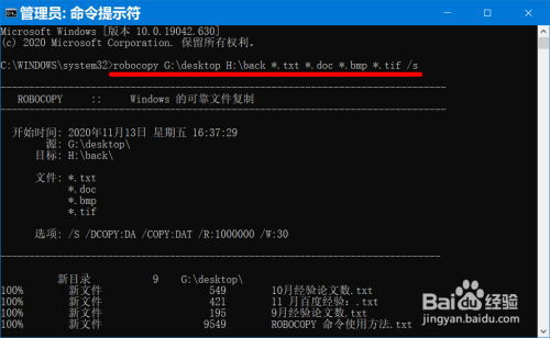 复制 robocopy G:\desktop H:\back *.txt *.doc *.bmp *.tif /s 到办理员号令提醒符窗口中,再按下键盘上的回车键;