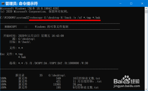 复制 robocopy G:\desktop H:\back /e /xf *.tmp *.bak 号令到办理员号令提醒符窗口中,按下键盘上的回车键。
