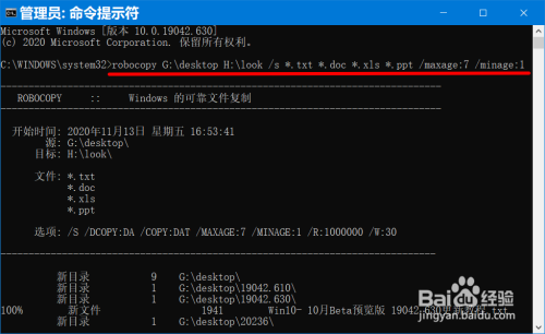 复制robocopy G:\desktop H:\look /s *.txt *.doc *.xls *.ppt /maxage:7 /minage:1到办理员号令提醒符窗口中,回车。