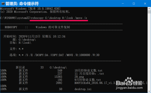 复制robocopy G:\desktop H:\look /move /e 号令到办理员号令提醒符窗口中,按下回车键即起头运行,最终G:\中的 desktop 文件夹移到了H:\desktop 文件夹。