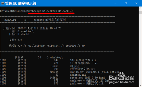 复制 robocopy G:\desktop H:\back /e 号令到办理员号令提醒符窗口中,按下键盘上的回车键;